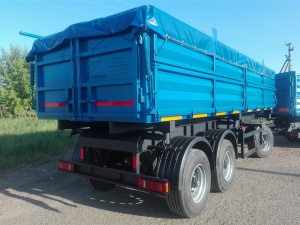 Трехосный прицеп зерновоз самосвал двухскатный 20 тонный с разгрузкой на две или три стороны, для перевозки зерновых культур и не только. Обычно идет в составе автопоезда КАМАЗ зерновоз с прицепом.